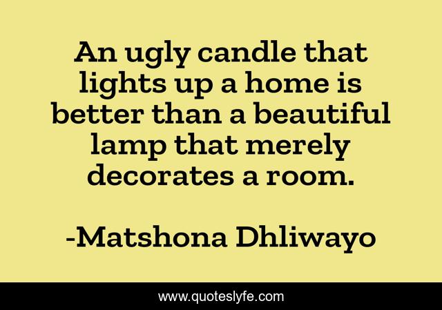 "Matshona Dhliwayo Quotes." Quoteslyfe.com, 2025. Sat. 06 Dec. 2025. <https://www.quoteslyfe.com/quote/An-ugly-candle-that-lights-up-a-98013>.