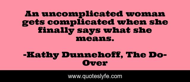 This page presents the quote "An uncomplicated woman gets complicated when she finally says what she means.". Author of this quote is Kathy Dunnehoff, The Do-Over. .