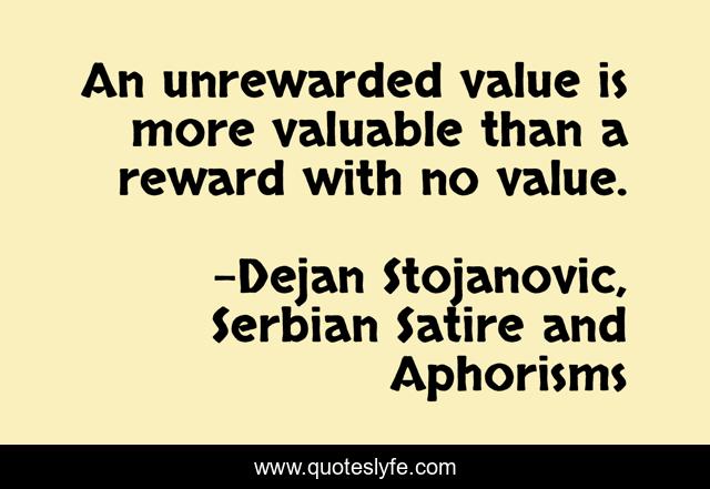 This page presents the quote "An unrewarded value is more valuable than a reward with no value.". Author of this quote is Dejan Stojanovic, Serbian Satire and Aphorisms. This quote is about dejan-stojanovic, reward, value,.