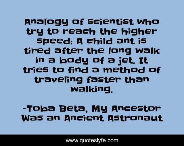 This page presents the quote "Analogy of scientist who try to reach the higher speed: A child ant is tired after the long walk in a body of a jet. It tries to find a method of traveling faster than walking.". Author of this quote is Toba Beta, My Ancestor Was an Ancient Astronaut. This quote is about mystery, inspirational, science, secret, truth, enthusiasm, technology,.
