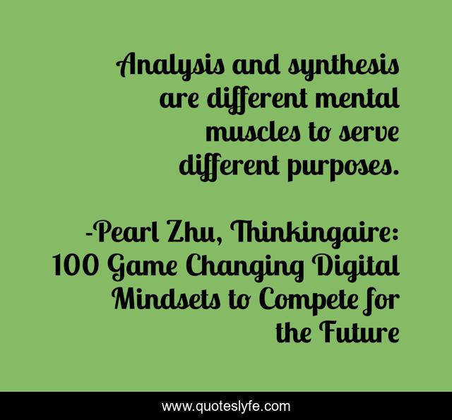 This page presents the quote "Analysis and synthesis are different mental muscles to serve different purposes.". Author of this quote is Pearl Zhu, Thinkingaire: 100 Game Changing Digital Mindsets to Compete for the Future. This quote is about mindset, digital-thinking, analysis, synthesis,.