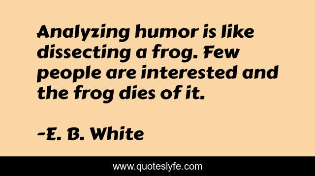 This page presents the quote "Analyzing humor is like dissecting a frog. Few people are interested and the frog dies of it.". Author of this quote is E. B. White. This quote is about like, frog, people,.