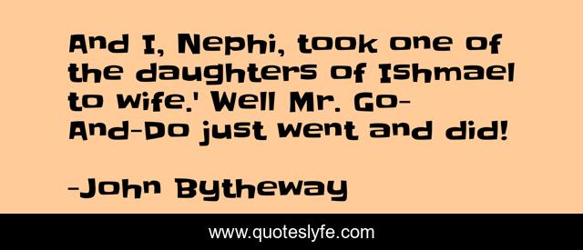 This page presents the quote "And I, Nephi, took one of the daughters of Ishmael to wife.' Well Mr. Go-And-Do just went and did!". Author of this quote is John Bytheway. This quote is about humor, dating, love, affection, religion,.