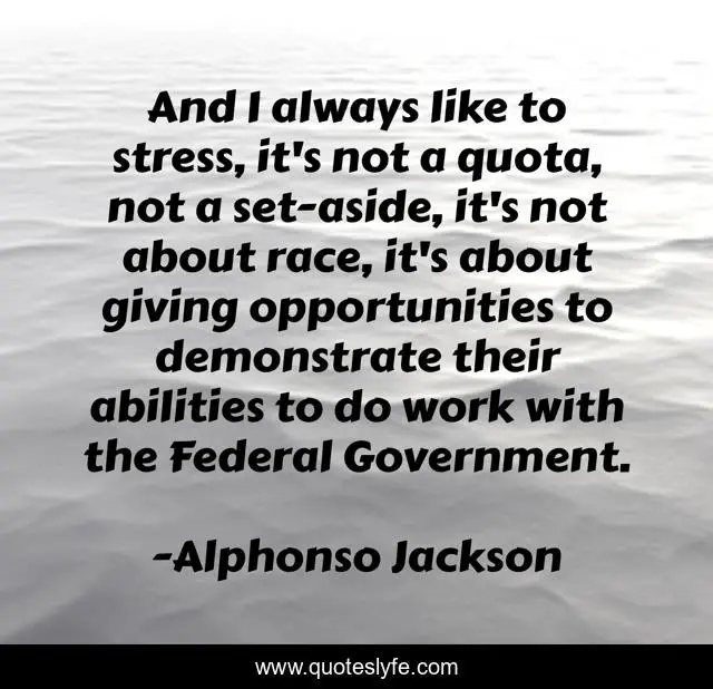 This page presents the quote "And I always like to stress, it's not a quota, not a set-aside, it's not about race, it's about giving opportunities to demonstrate their abilities to do work with the Federal Government.". Author of this quote is Alphonso Jackson. This quote is about giving, stress, work,.