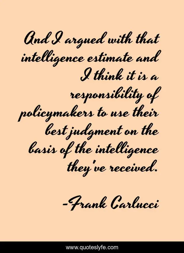 This page presents the quote "And I argued with that intelligence estimate and I think it is a responsibility of policymakers to use their best judgment on the basis of the intelligence they've received.". Author of this quote is Frank Carlucci. This quote is about responsibility, think, best,.