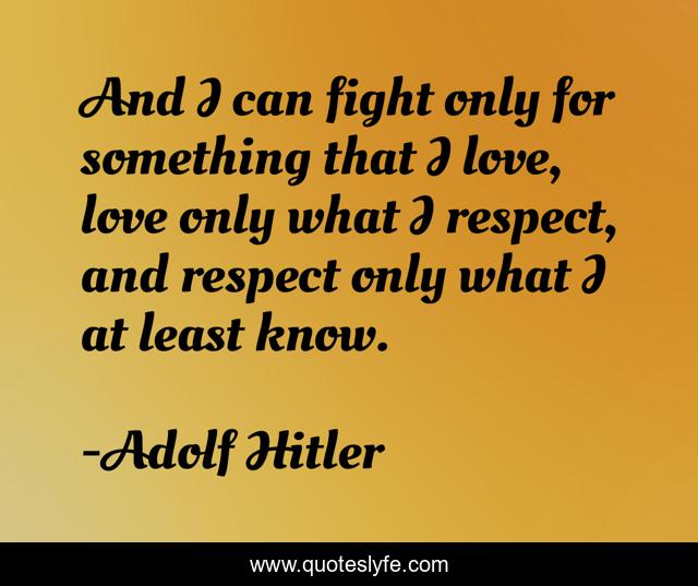 This page presents the quote "And I can fight only for something that I love, love only what I respect, and respect only what I at least know.". Author of this quote is Adolf Hitler. This quote is about respect, love, affection, fight,.