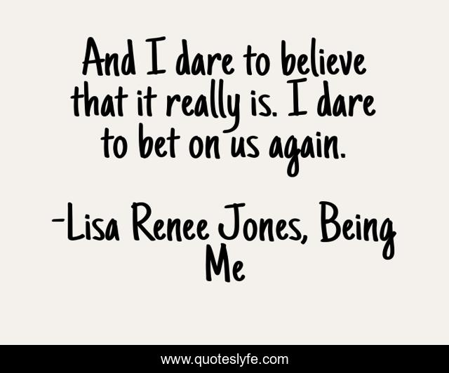 This page presents the quote "And I dare to believe that it really is. I dare to bet on us again.". Author of this quote is Lisa Renee Jones, Being Me. This quote is about relationships, love, second-chances, dare, gamble, believe, affection,.