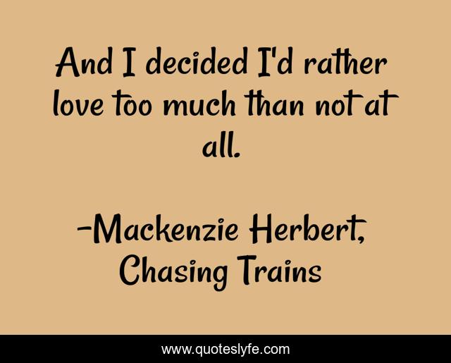 This page presents the quote "And I decided I'd rather love too much than not at all.". Author of this quote is Mackenzie Herbert, Chasing Trains. This quote is about love, loving-too-much, love-too-much, quote, chasing-trains, affection, loving,.