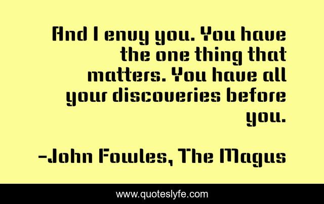 This page presents the quote "And I envy you. You have the one thing that matters. You have all your discoveries before you.". Author of this quote is John Fowles, The Magus. This quote is about youth, coming-of-age, enlightenment, discovery,.
