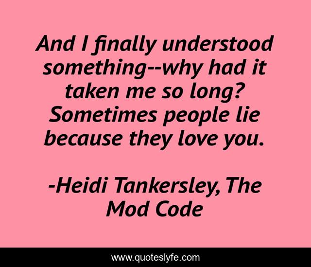 This page presents the quote "And I finally understood something--why had it taken me so long? Sometimes people lie because they love you.". Author of this quote is Heidi Tankersley, The Mod Code. This quote is about romance, sacrifice, love, affection,.