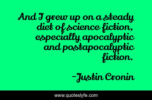 This page presents the quote "And I grew up on a steady diet of science fiction, especially apocalyptic and postapocalyptic fiction.". Author of this quote is Justin Cronin. This quote is about science, up, fiction,.