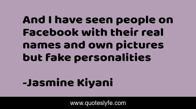 This page presents the quote "And I have seen people on Facebook with their real names and own pictures but fake personalities". Author of this quote is Jasmine Kiyani. This quote is about real, personalities, people, pictures, facebook, names, fake,.