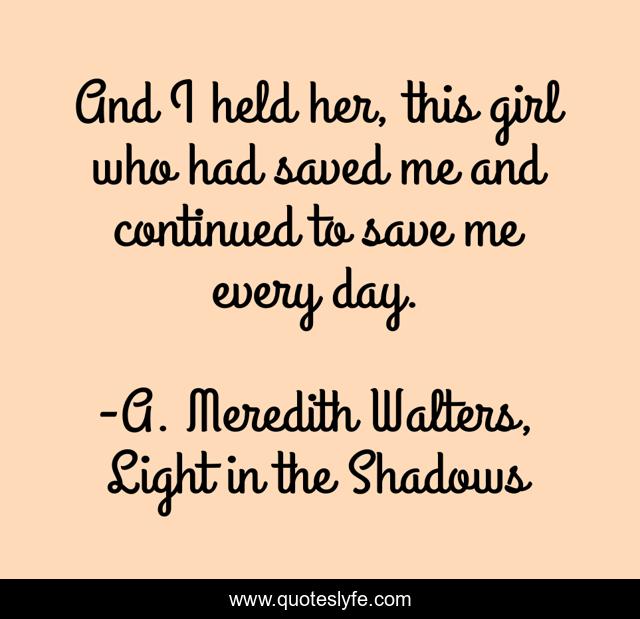 This page presents the quote "And I held her, this girl who had saved me and continued to save me every day.". Author of this quote is A. Meredith Walters, Light in the Shadows. .