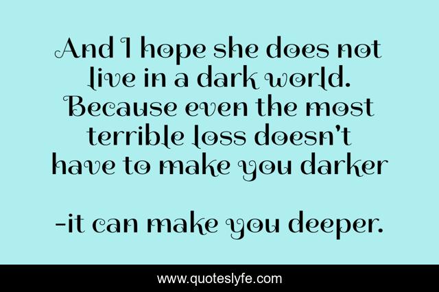 This page presents the quote "And I hope she does not live in a dark world. Because even the most terrible loss doesn't have to make you darker". Author of this quote is it can make you deeper.. This quote is about this is how: proven aid in overcoming shyness, molestation, spinsterhood, augusten burroughs, disease, fatness, grief, lushery, decrepitude & more. for young and old alike.,.