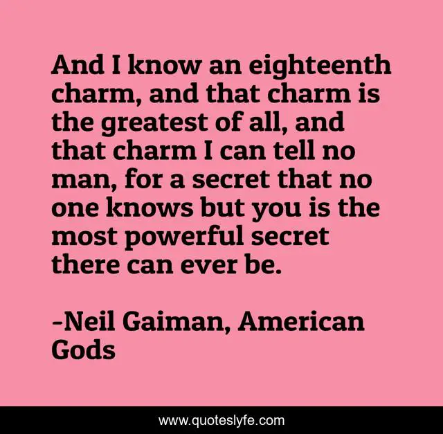 This page presents the quote "And I know an eighteenth charm, and that charm is the greatest of all, and that charm I can tell no man, for a secret that no one knows but you is the most powerful secret there can ever be.". Author of this quote is Neil Gaiman, American Gods. This quote is about good, neil-gaiman, american-gods,.