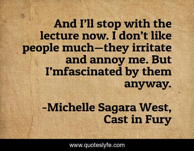 This page presents the quote "And I’ll stop with the lecture now. I don’t like people much—they irritate and annoy me. But I’mfascinated by them anyway.". Author of this quote is Michelle Sagara West, Cast in Fury. This quote is about story, kaylin, rennick, people,.