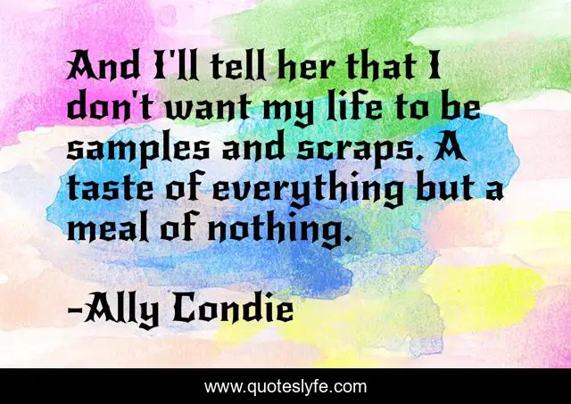 This page presents the quote "And I'll tell her that I don't want my life to be samples and scraps. A taste of everything but a meal of nothing.". Author of this quote is Ally Condie. This quote is about life, ally-condie, matched,.