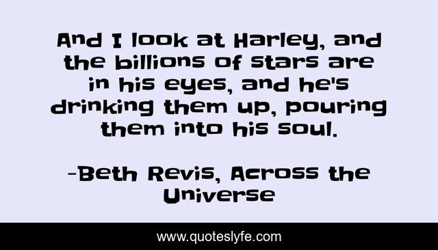 This page presents the quote "And I look at Harley, and the billions of stars are in his eyes, and he's drinking them up, pouring them into his soul.". Author of this quote is Beth Revis, Across the Universe. This quote is about across-the-universe, elder, beth-revis, stars, harley,.