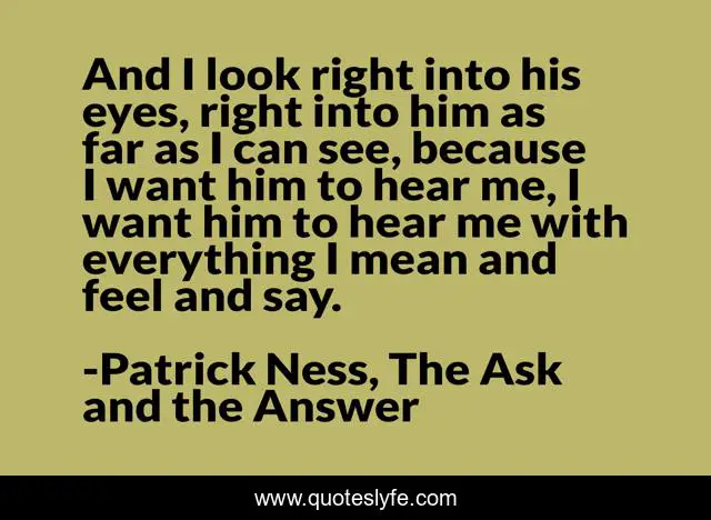 This page presents the quote "And I look right into his eyes, right into him as far as I can see, because I want him to hear me, I want him to hear me with everything I mean and feel and say.". Author of this quote is Patrick Ness, The Ask and the Answer. This quote is about love, communication, chaos-walking, patrick-ness, viola, todd, friendships, affection,.