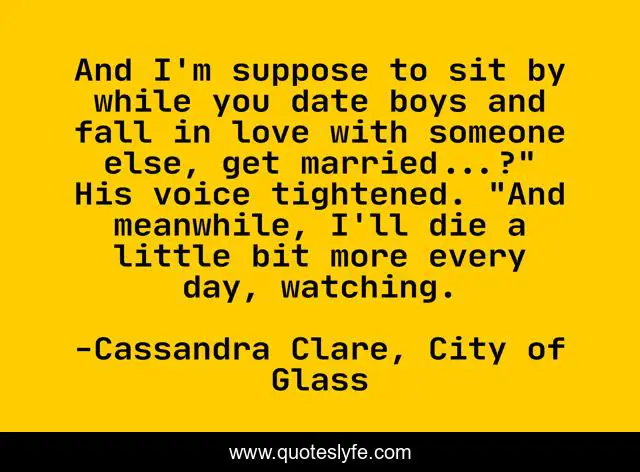 This page presents the quote "And I'm suppose to sit by while you date boys and fall in love with someone else, get married...?" His voice tightened. "And meanwhile, I'll die a little bit more every day, watching.". Author of this quote is Cassandra Clare, City of Glass. This quote is about romance, mortal-instruments, teen-fantasy,.