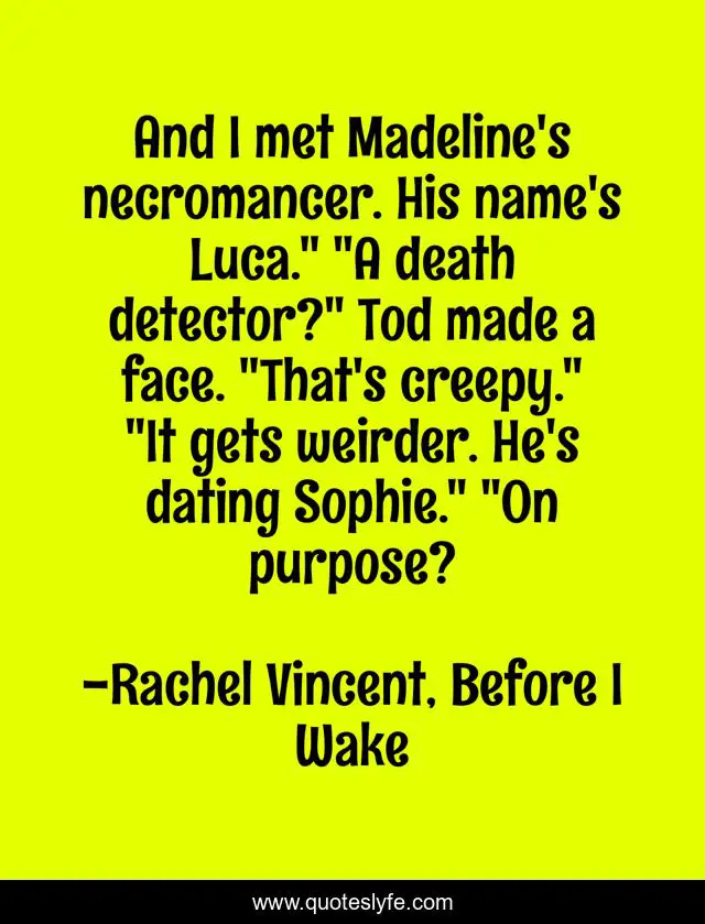 This page presents the quote "And I met Madeline's necromancer. His name's Luca." "A death detector?" Tod made a face. "That's creepy." "It gets weirder. He's dating Sophie." "On purpose?". Author of this quote is Rachel Vincent, Before I Wake. This quote is about death, dating,.