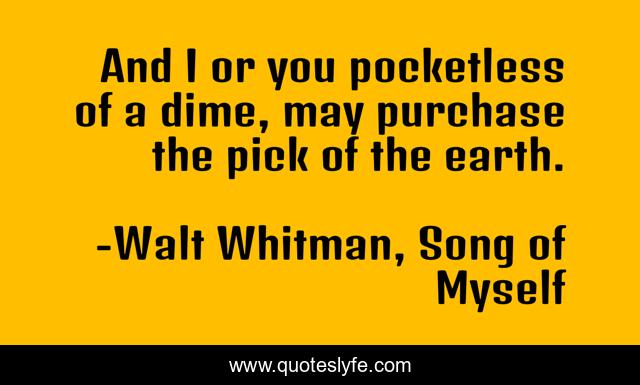 This page presents the quote "And I or you pocketless of a dime, may purchase the pick of the earth.". Author of this quote is Walt Whitman, Song of Myself. This quote is about leaves-of-grass, whitman, nature, song, poetry, earth, highland,.