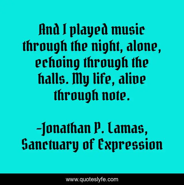 This page presents the quote "And I played music through the night, alone, echoing through the halls. My life, alive through note.". Author of this quote is Jonathan P. Lamas, Sanctuary of Expression. This quote is about music, alone-but-not-lonely, alive, night,.