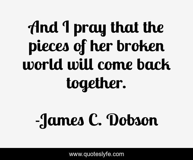 This page presents the quote "And I pray that the pieces of her broken world will come back together.". Author of this quote is James C. Dobson. This quote is about broken, pray, together, pieces, come-back, world,.