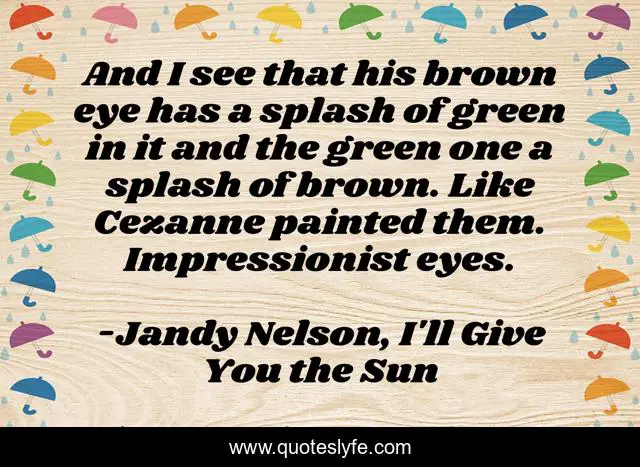 This page presents the quote "And I see that his brown eye has a splash of green in it and the green one a splash of brown. Like Cezanne painted them. Impressionist eyes.". Author of this quote is Jandy Nelson, I'll Give You the Sun. This quote is about art, eyes, painting,.