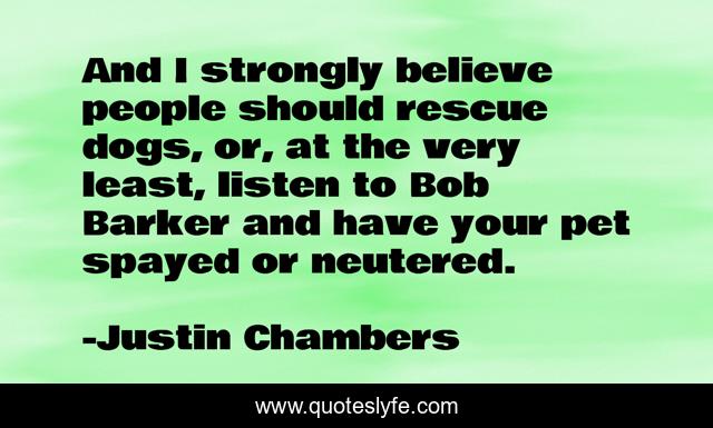 This page presents the quote "And I strongly believe people should rescue dogs, or, at the very least, listen to Bob Barker and have your pet spayed or neutered.". Author of this quote is Justin Chambers. This quote is about believe, people, listen,.