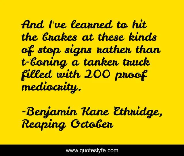 This page presents the quote "And I've learned to hit the brakes at these kinds of stop signs rather than t-boning a tanker truck filled with 200 proof mediocrity.". Author of this quote is Benjamin Kane Ethridge, Reaping October. This quote is about dark-fiction, horror-genre, horror, writing-process, writing, horror-writer, writers, horror-fantasy, horror-fiction,.