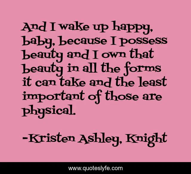 This page presents the quote "And I wake up happy, baby, because I possess beauty and I own that beauty in all the forms it can take and the least important of those are physical.". Author of this quote is Kristen Ashley, Knight. This quote is about possessive, love, beauty, knight, romance, alpha, affection,.