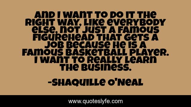 This page presents the quote "And I want to do it the right way, like everybody else, not just a famous figurehead that gets a job because he is a famous basketball player. I want to really learn the business.". Author of this quote is Shaquille O'Neal. This quote is about famous, job,.