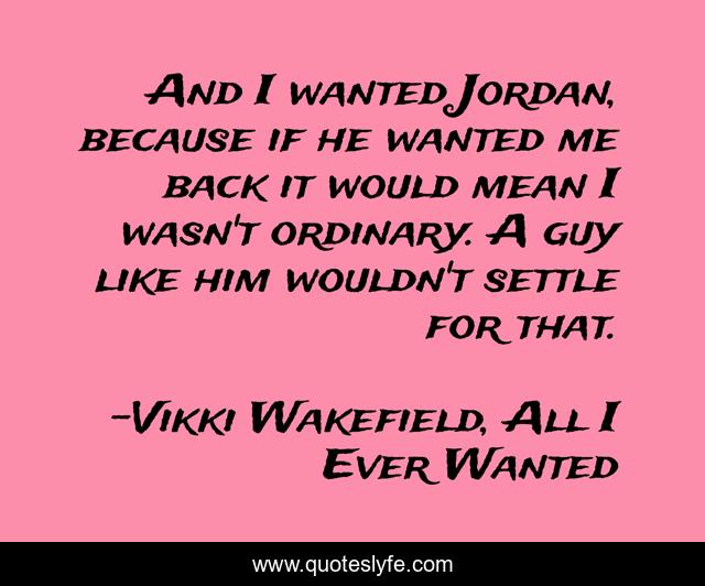 This page presents the quote "And I wanted Jordan, because if he wanted me back it would mean I wasn't ordinary. A guy like him wouldn't settle for that.". Author of this quote is Vikki Wakefield, All I Ever Wanted. This quote is about longing, love, guys, boys, special, ordinary, teen-love, affection,.