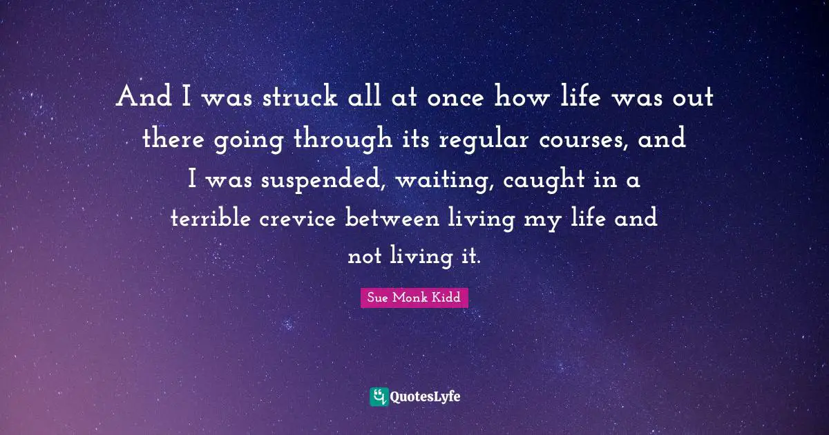 This page presents the quote "And I was struck all at once how life was out there going through its regular courses, and I was suspended, waiting, caught in a terrible crevice between living my life and not living it.". Author of this quote is Sue Monk Kidd. This quote is about suspended, courses, crevice, caught, terrible, waiting, life, living my life,.
