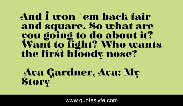 This page presents the quote "And I won 'em back fair and square. So what are you going to do about it? Want to fight? Who wants the first bloody nose?". Author of this quote is Ava Gardner, Ava: My Story. This quote is about marbles, fighting, ava-gardner,.