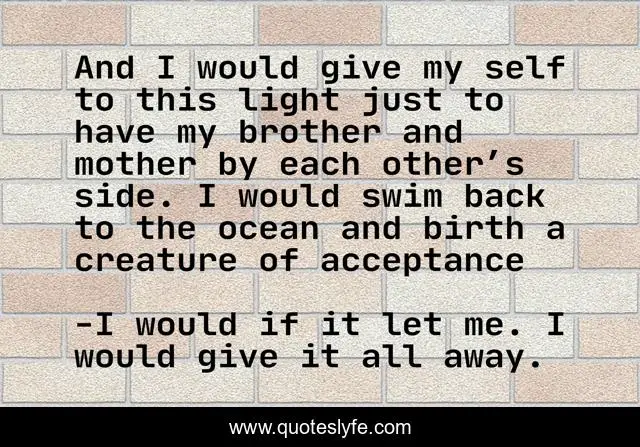 This page presents the quote "And I would give my self to this light just to have my brother and mother by each other’s side. I would swim back to the ocean and birth a creature of acceptance". Author of this quote is I would if it let me. I would give it all away.. This quote is about but dreaming, a.p. sweet, dead,.