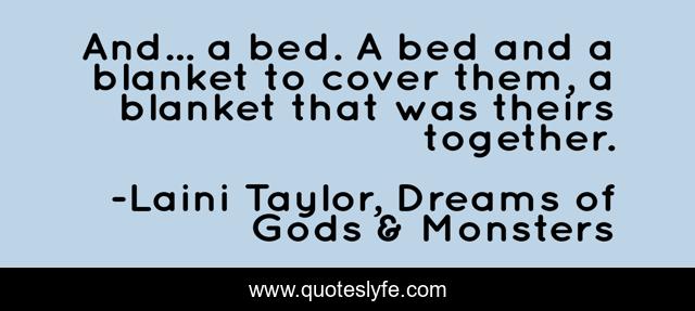 This page presents the quote "And... a bed. A bed and a blanket to cover them, a blanket that was theirs together.". Author of this quote is Laini Taylor, Dreams of Gods & Monsters. This quote is about simplicity, love, blanket, bed, angels, affection,.
