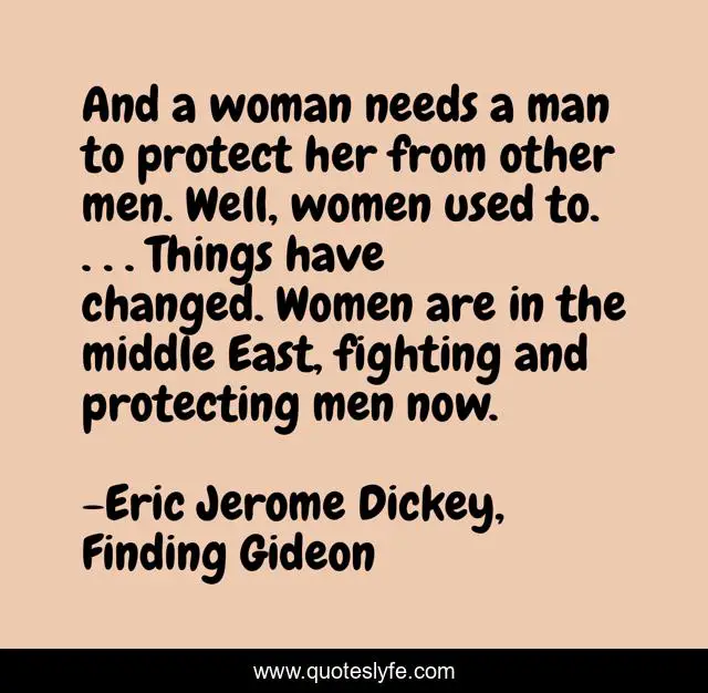 This page presents the quote "And a woman needs a man to protect her from other men. Well, women used to. . . . Things have changed. Women are in the middle East, fighting and protecting men now.". Author of this quote is Eric Jerome Dickey, Finding Gideon. This quote is about real, dialogue, medianoche-to-gideon, food-for-thought,.