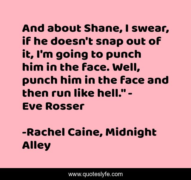 This page presents the quote "And about Shane, I swear, if he doesn't snap out of it, I'm going to punch him in the face. Well, punch him in the face and then run like hell." - Eve Rosser". Author of this quote is Rachel Caine, Midnight Alley. This quote is about fun, shane-collins, eve-rosser, rachel-caine, midnight-alley,.