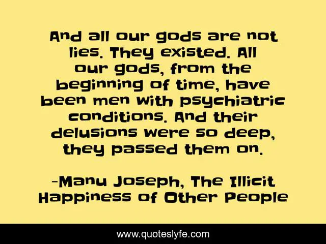 This page presents the quote "And all our gods are not lies. They existed. All our gods, from the beginning of time, have been men with psychiatric conditions. And their delusions were so deep, they passed them on.". Author of this quote is Manu Joseph, The Illicit Happiness of Other People. This quote is about gods, religion-spirituality, religion, religious-faith, lies, delusions, god, psychiatry,.