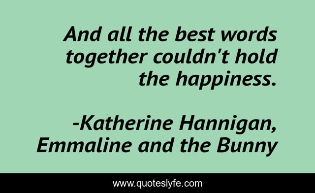 This page presents the quote "And all the best words together couldn't hold the happiness.". Author of this quote is Katherine Hannigan, Emmaline and the Bunny. This quote is about happiness, words,.