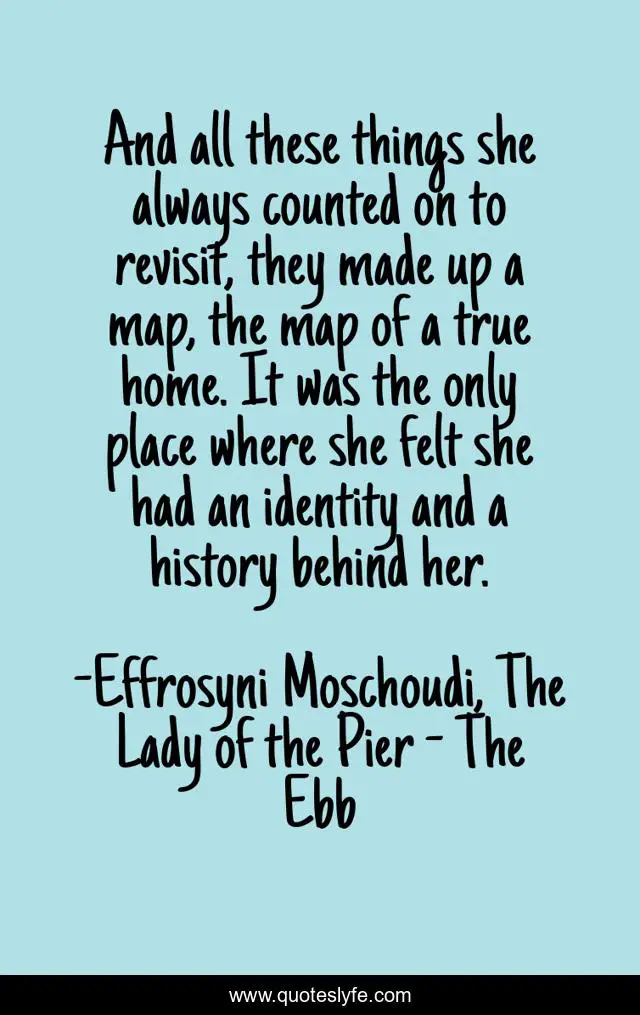 This page presents the quote "And all these things she always counted on to revisit, they made up a map, the map of a true home. It was the only place where she felt she had an identity and a history behind her.". Author of this quote is Effrosyni Moschoudi, The Lady of the Pier - The Ebb. This quote is about memories, nostalgia,.