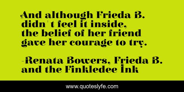 This page presents the quote "And although Frieda B. didn't feel it inside, the belief of her friend gave her courage to try.". Author of this quote is Renata Bowers, Frieda B. and the Finkledee Ink. This quote is about gifts, childhood, friendship, worth, belief,.