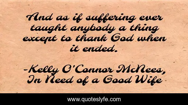 This page presents the quote "And as if suffering ever taught anybody a thing except to thank God when it ended.". Author of this quote is Kelly O'Connor McNees, In Need of a Good Wife. .