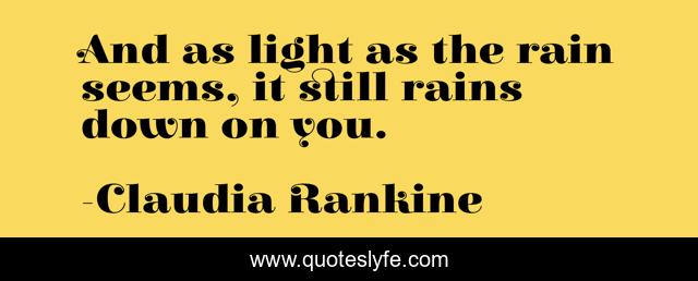 This page presents the quote "And as light as the rain seems, it still rains down on you.". Author of this quote is Claudia Rankine. This quote is about quote, claudia-rankine, rain, citizen,.