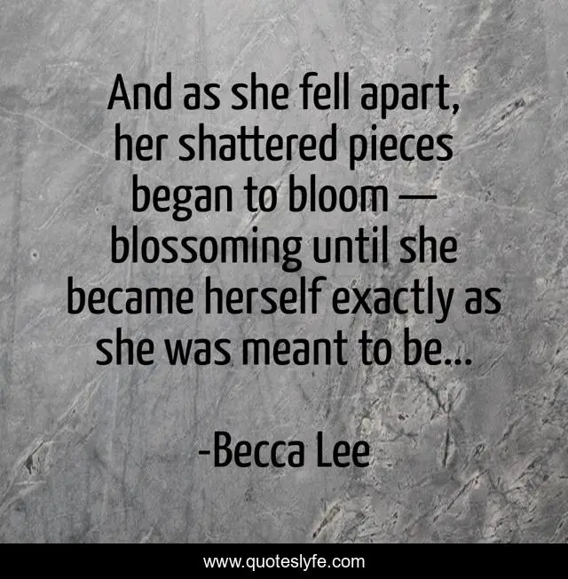 This page presents the quote "And as she fell apart, her shattered pieces began to bloom — blossoming until she became herself exactly as she was meant to be...". Author of this quote is Becca Lee. This quote is about shattered, healing-journey, recovery, survivors, broken, healing,.