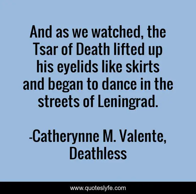 This page presents the quote "And as we watched, the Tsar of Death lifted up his eyelids like skirts and began to dance in the streets of Leningrad.". Author of this quote is Catherynne M. Valente, Deathless. .