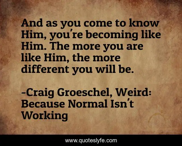 This page presents the quote "And as you come to know Him, you're becoming like Him. The more you are like Him, the more different you will be.". Author of this quote is Craig Groeschel, Weird: Because Normal Isn't Working. This quote is about be, different, like, you-re-becoming, to, as, the, come, him,.