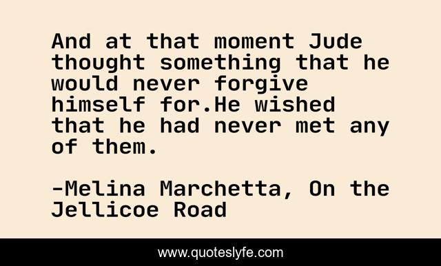 This page presents the quote "And at that moment Jude thought something that he would never forgive himself for.He wished that he had never met any of them.". Author of this quote is Melina Marchetta, On the Jellicoe Road. .